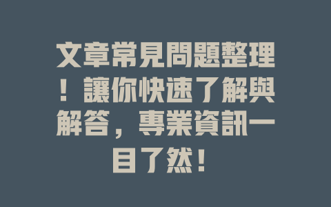 在這篇文章中,我們精心整理了有關各類文章的常見問題,旨在幫助讀者更快速且清晰地了解相關資訊。無論你對於文章的格式、結構,或是如何有效地撰寫內容有疑問,本篇都將提供你所需的解答。文章涵蓋了常見問題的各個方面,包括標題的設計、段落的組織及文體的選擇等,讓每位寫作者都能從中獲益。 我們還將分享專家提供的技巧和建議,幫助你避免常見的寫作陷阱,提升文章的質量。這不僅僅是一次簡單的FAQ整理,更是一次寫作技巧的全面提升。倘若你希望在文章創作的道路上更上一層樓,這篇整理將是你不可或缺的參考資源,讓你在追求專業資訊的過程中,能夠事半而功倍,快速掌握所需的知識與技巧。無論你是新手還是有經驗的寫作者,都能在這裡找到實用的資訊,助你更好地展現你的創意與才華。