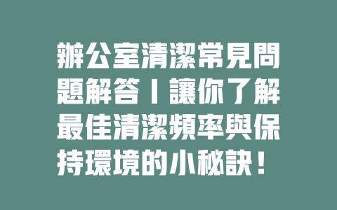 在辦公室工作環境中,清潔的頻率影響著整體的工作氛圍和員工的健康。一個乾淨整潔的辦公區不僅能提升員工的工作效率,還能減少病菌的傳播,降低病假率。那麼,辦公室清潔到底應該幾耐一次呢?這裡有一些專業的建議。