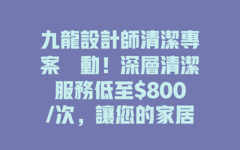 透過這項服務,您將能夠享受乾淨、健康的生活空間,讓居家環境變得更加舒適。今年就來試試這個深層清潔服務,讓九龍設計師為您帶來不一樣的清潔體驗!## 常見問題 (FAQ)