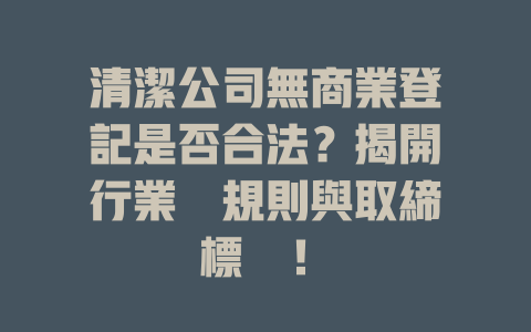 只要做到这些,基本上就能在清洁服务的选择上更加自信,确保自己获得优质的服务。如果你自己尝试过或碰到过这样的情况,欢迎和我聊聊,也许我们可以一起分享更多的经验!想要保持家裡清潔整齊,常常需要依賴專業的清潔服務。可是,市場上這麼多的清潔公司,你知道怎麼選擇才不會踩雷嗎?尤其是有些公司其實沒有工商登記,這樣的企業到底合法嗎?這篇文章就來聊聊這個問題,幫你弄清楚在選擇清潔公司時應該注意的事項。