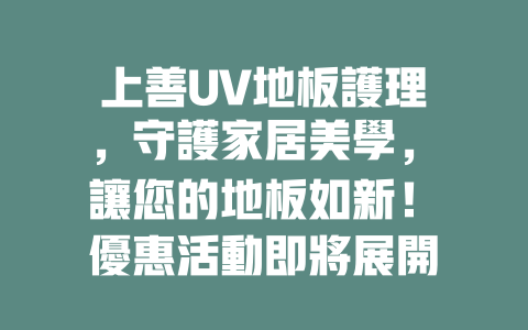 走進家中,感受那份自然、清新的氛圍,讓每一步都充滿舒適。選擇上善UV地板護理,不僅是對家居美學的追求,更是對生活品質的升華。快來參加我們的優惠活動,讓您的地板重獲新生,為您的家居空間增添一份亮麗的風采!